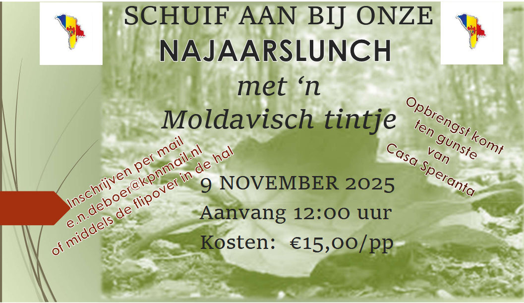 ![]() Tijdens de kerkdienst op 9 november vieren we de dankdag voor de oogst. Dit lijkt ons de uitgelezen gelegenheid om aansluitend weer eens een mooie lunch te organiseren: een Najaarslunch met een Moldavisch tintje met ingrediënten afkomstig van ons vruchtbare land, waarbij de opbrengst naar ons diaconale project Casa Speranta gaat. De kosten bedragen € 15,00/pp. Aanvang 12:00 uur. | ||